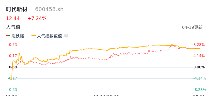 04月19日,时代新材收报12.44,股价涨幅7.24%,成交金额3.32亿元,换手率3.42%。