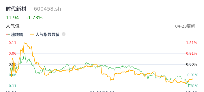 04月23日,时代新材收报11.94,股价涨幅-1.73%,成交金额1.44亿元,换手率1.49%。