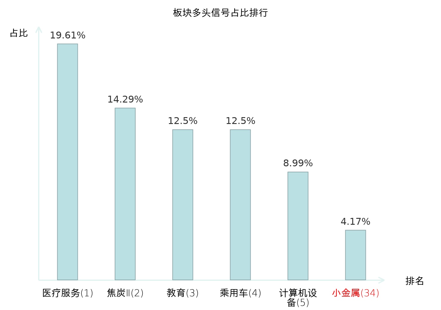全市场所有行业板块中主力多头信号占比排名中,医疗服务板块位居第一。焦炭Ⅱ板块名次提升最快,较昨日上升119位。