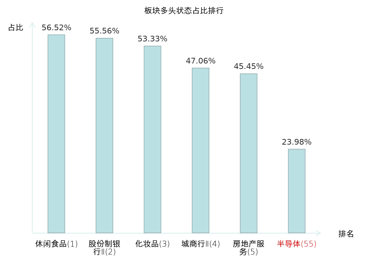 全市场所有行业板块中主力多头状态占比排名中,休闲食品板块位居第一。汽车服务板块名次提升最快,较昨日上升90位。
