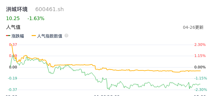 04月26日,洪城环境收报10.25,股价涨幅-1.63%,成交金额1.16亿元,换手率0.99%。
