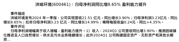 值得注意的是:2024年04月长江证券的徐科/任楠/贾少波/赵智勇/李博文分析师,首次发布关于洪城环境的研究报告,标题为:洪城环境(600461):归母净利润同比增8.65% 盈利能力提升。