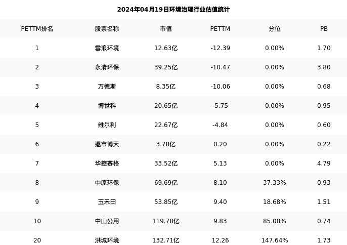 从估值角度看:洪城环境最新市盈率PETTM为12.26,在行业内排名15/105,处于147.64分位。