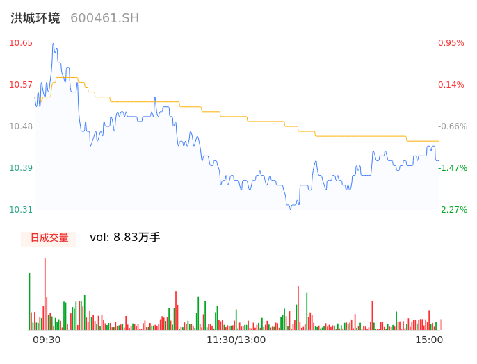 04月18日,洪城环境收报10.41,股价涨幅-1.33%,成交金额9249.25万元,换手率0.78%。