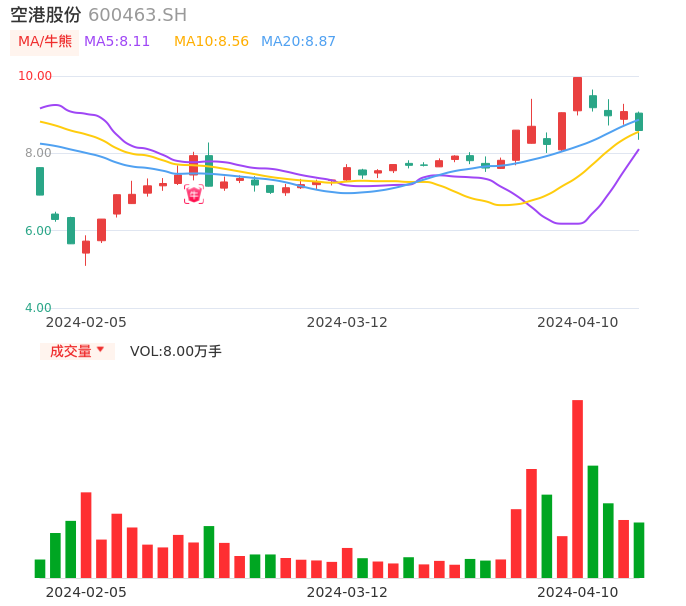 04月10日,空港股份收报8.59,股价涨幅-5.40%,成交金额6915.62万元,换手率2.67%。