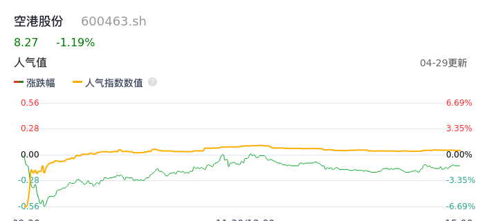 04月29日,空港股份收报8.27,股价涨幅-1.19%,成交金额4813.19万元,换手率1.98%。
