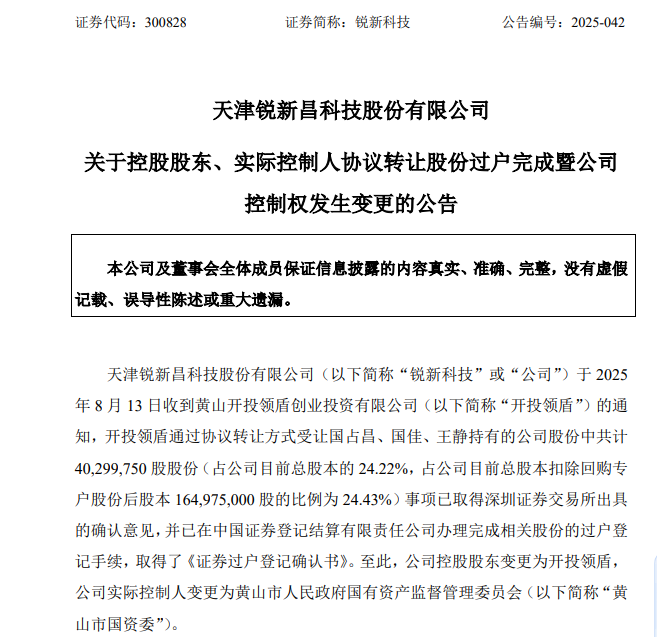 如今时隔4个半月,锐新科技正式迎来黄山国资入主。