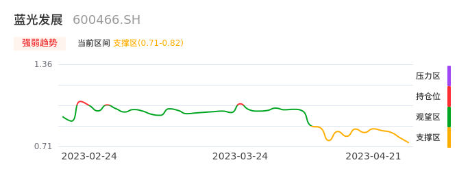 我们来看一下该股的九方特色指标强弱趋势的情况:蓝光发展自04月06日进入支撑区。股价出现一波快速下跌行情,目前下跌动能仍未衰竭。建议继续谨慎观望。注意今日下方支撑位:0.71元,如有效跌破将可能出现新一轮下跌。