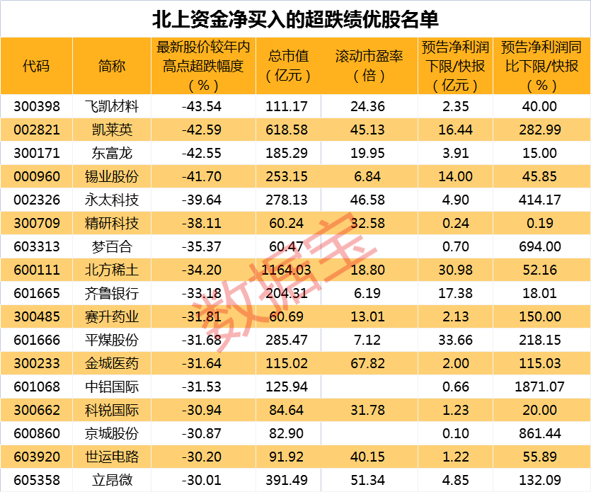 本周以来,凯莱英、平煤股份、锡业股份、立昂微等17股获北上资金净买入,陕西金叶、永太科技、平煤股份等21股主力净流入额累计录得正值。其中,飞凯材料、东富龙、北方稀土等超跌股市盈率均不足30倍。