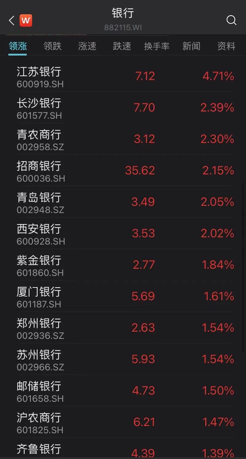 江苏银行领涨银行板块,招商银行则终结此前11连阴的走势,午间收盘上涨2.15%。