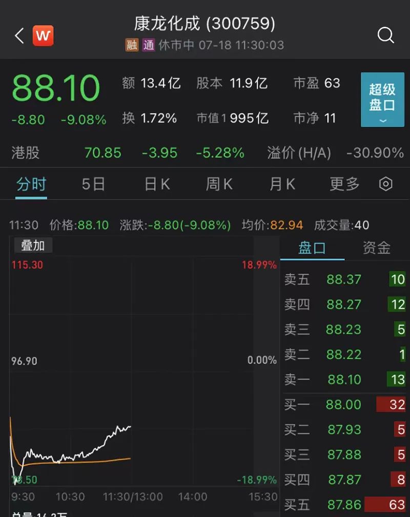 港股方面,康龙化成H股盘中也一度重挫超15%,午间收盘跌幅收窄至5.28%。