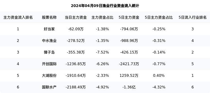 好当家今日净流出62.09万元,主力占比1.38%,在行业内排名:1/6;5日净流出794.06万元,主力占比0.25%,在行业内排名:3/6。