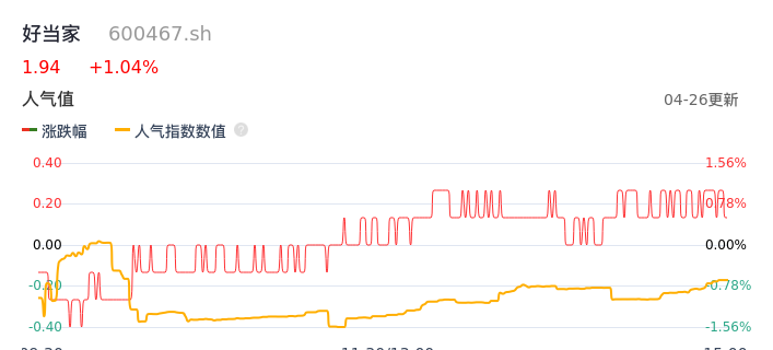04月26日,好当家收报1.94,股价涨幅1.04%,成交金额3812.88万元,换手率1.36%。