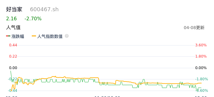 04月08日,好当家收报2.16,股价涨幅-2.70%,成交金额8039.03万元,换手率2.54%。
