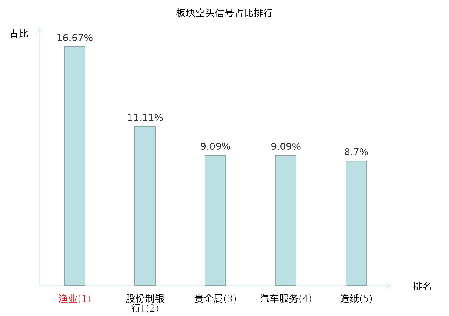 全市场所有行业板块中主力空头信号占比排名中,渔业板块位居第一。电机Ⅱ板块名次提升最快,较昨日上升113位。