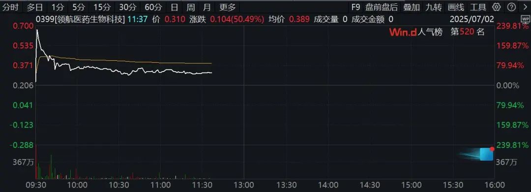 港股“领航医药生物科技”大幅高开高走,盘初一度直线飙涨239.81%,创8年多来新高,后虽有所回落,但截至发稿仍大涨逾50%,成交较前一交易日激增数十倍。