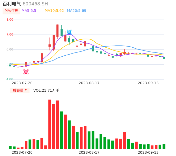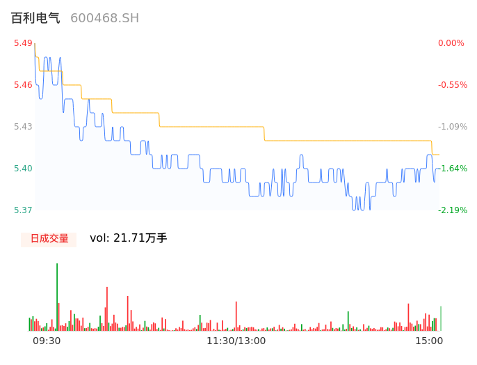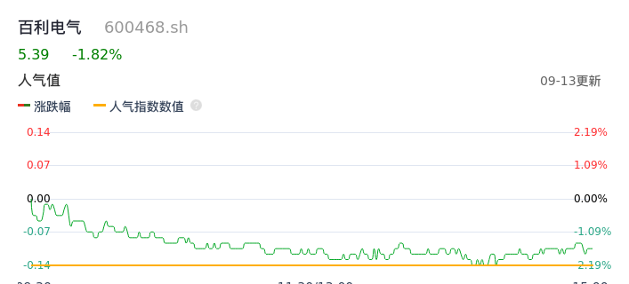 09月13日,百利电气收报5.39,股价涨幅-1.82%,成交金额1.18亿元,换手率2.00%。