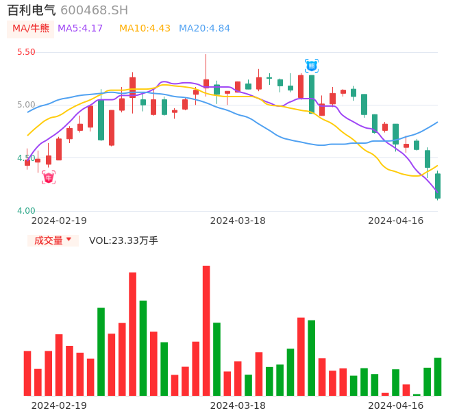 04月16日,百利电气收报4.12,股价涨幅-6.58%,成交金额9787.47万元,换手率2.14%。