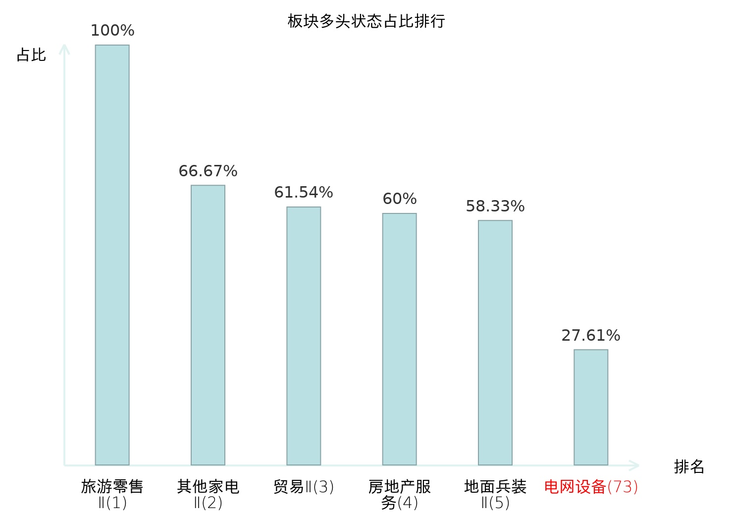 全市场所有行业板块中主力多头状态占比排名中,旅游零售Ⅱ板块位居第一。化妆品板块名次提升最快,较昨日上升62位。