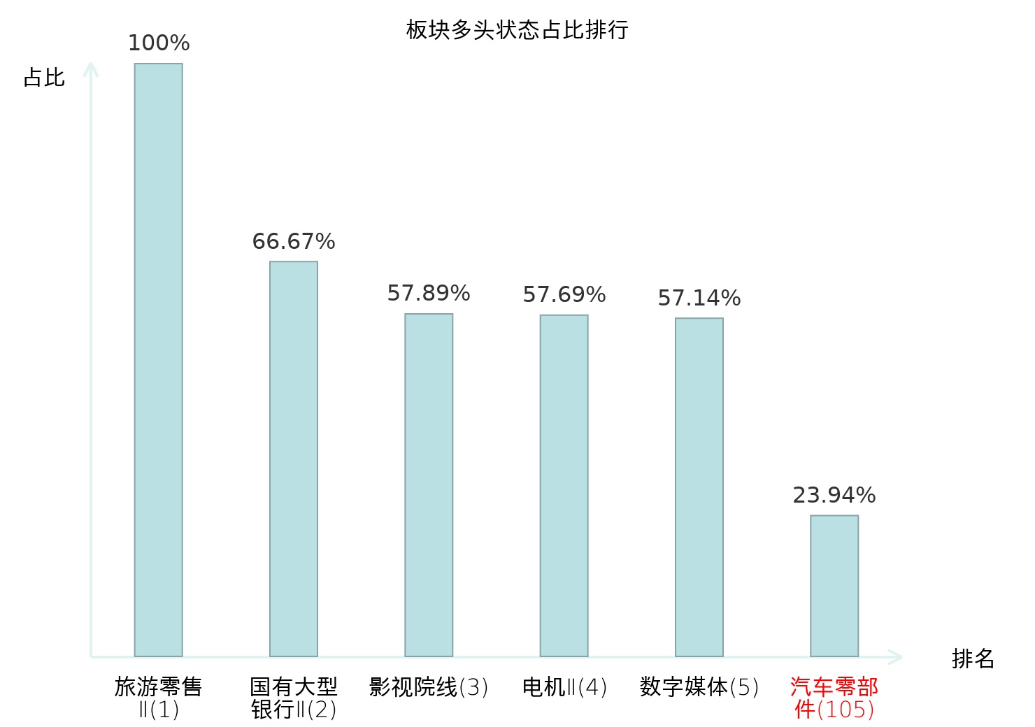 全市场所有行业板块中主力多头状态占比排名中,旅游零售Ⅱ板块位居第一。专业连锁Ⅱ板块名次提升最快,较昨日上升56位。