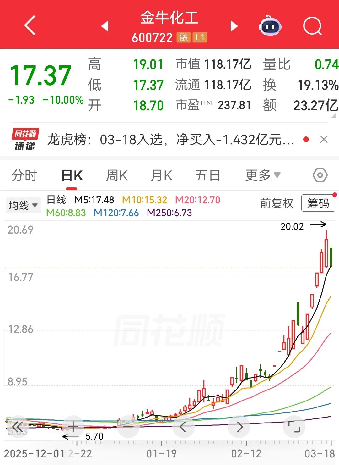 多只化工热门股今日遭遇大幅调整。金牛化工(600722)是近期最热门的化工股之一,该股于3月17日盘中股价突破20元/股,创下历史新高,年内最大涨幅一度达到2.3倍以上。该公司主要从事甲醇的生产和销售,产量为20万吨/年。今日该股大幅低开,收盘股价跌停。