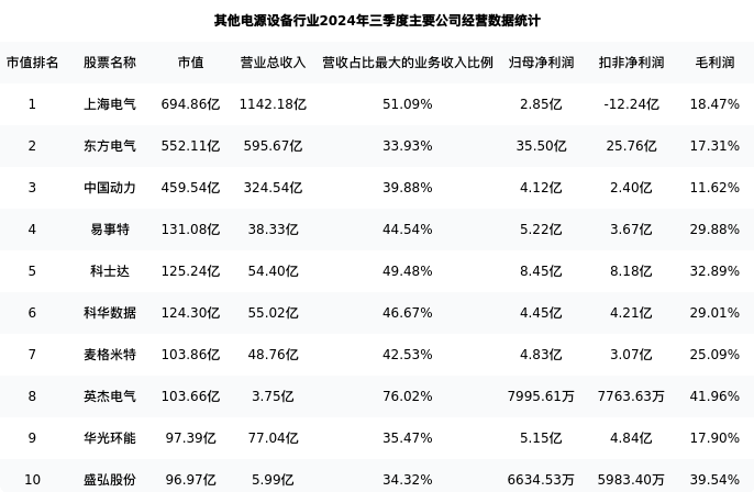 华光环能最新报告期数据为三季度,下表汇总了其他电源设备行业内市值靠前的公司三季度主要经营数据