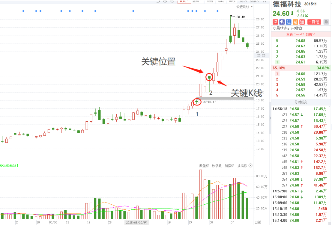 ①找到关键位置——这里指主升行情中最容易变盘的位置,通常是突破行情中的第二根阴线位置,它的意义在于确认次级别(30分钟或者60分钟)背离的动作,容易变盘。