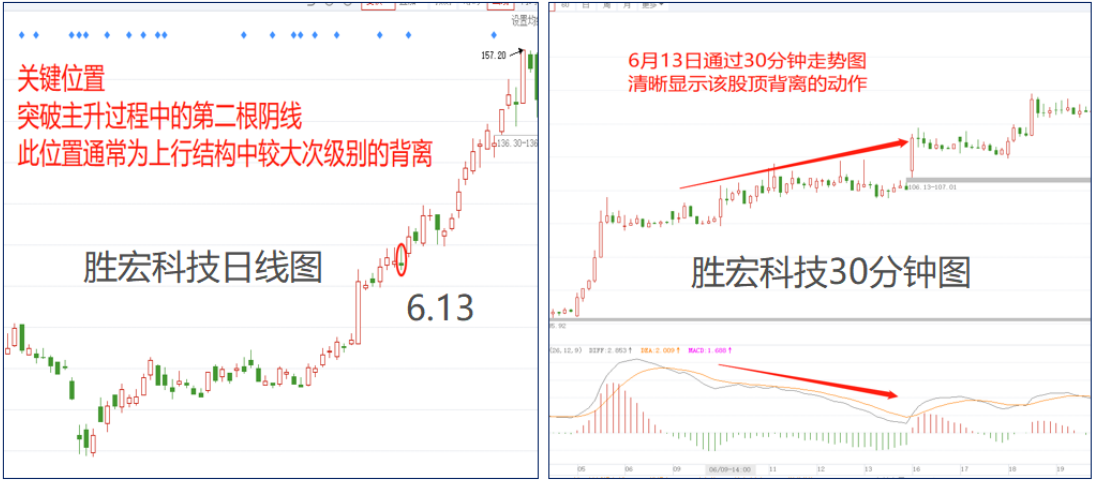 比如胜宏科技,在6月初放量突破箱体后,走出一段突破走势,6月13日当日,该股反弹中第二次遇阻回落,符合主升浪关键位置的判定标准。从30分钟走势图中,清晰显示当日该股出现30分钟顶背离动作。