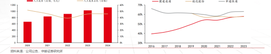 图表3:自营快递(顺丰)人工成本占成本超50%(左)加盟制快递派费成本占比较高(右)