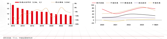 图表2:快递行业单价持续下行(左)快递公司利润(亿元)增速较慢(右)