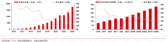 图表1:我国快递业务量快速增长(左)快递市场有望保持较高增速(右)