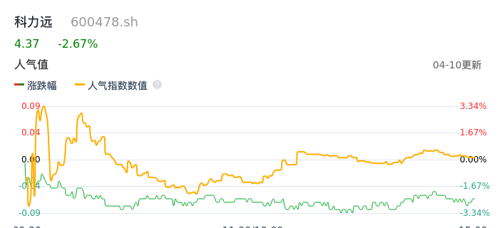 04月10日,科力远收报4.37,股价涨幅-2.67%,成交金额7995.40万元,换手率1.09%。