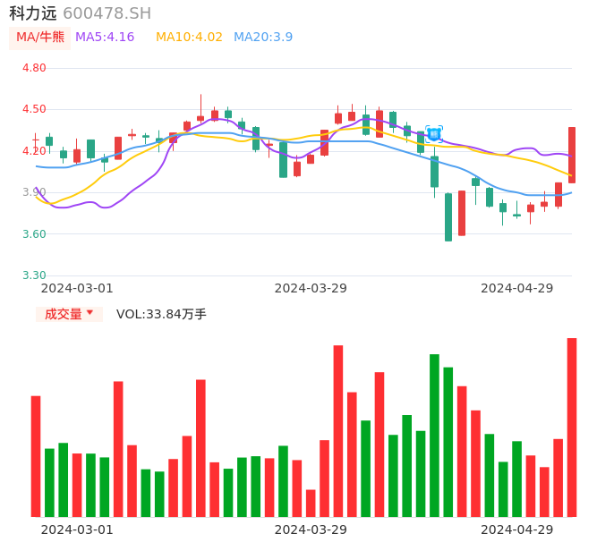 04月29日,科力远收报4.37,股价涨幅10.08%,成交金额1.45亿元,换手率2.03%。