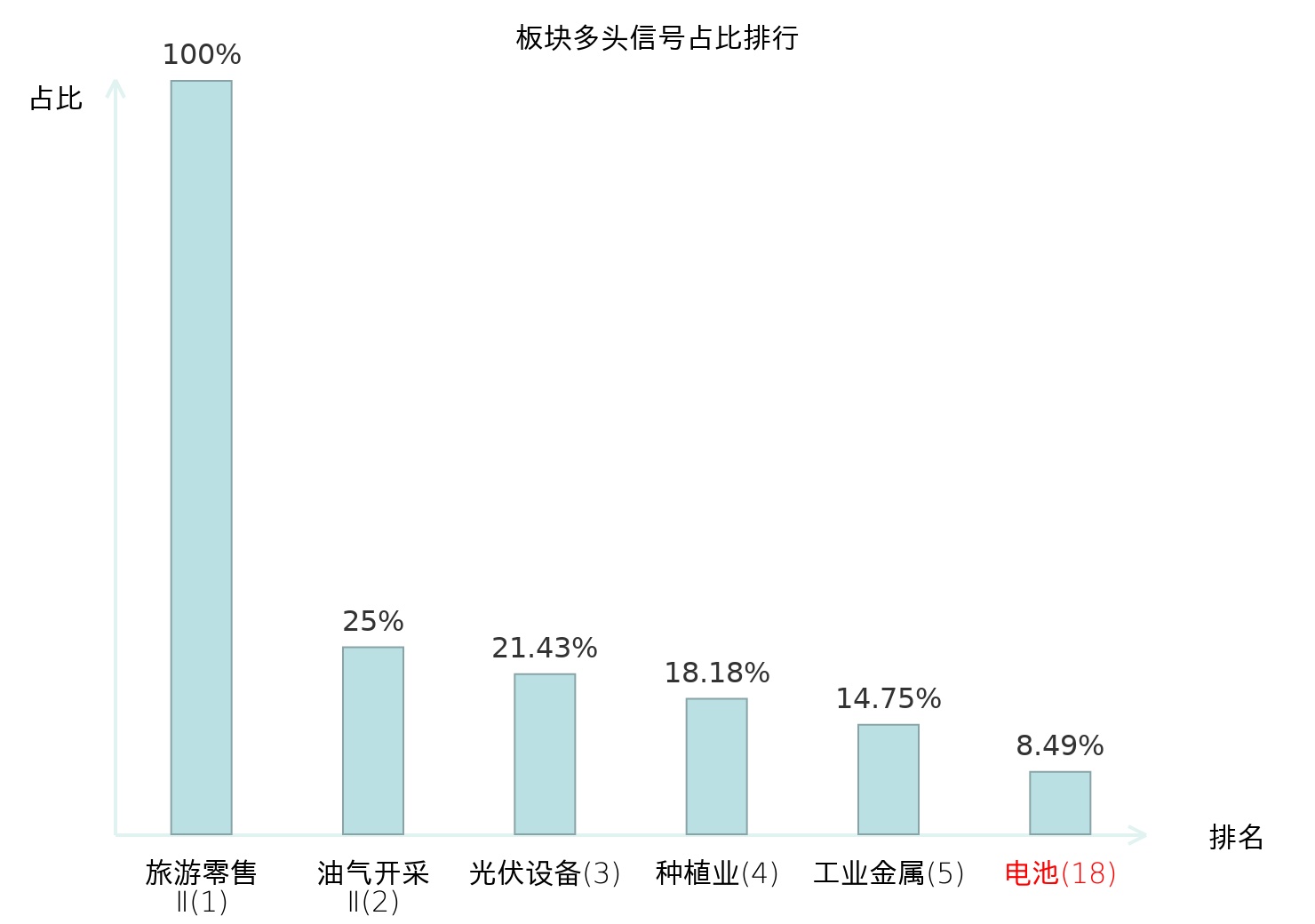 全市场所有行业板块中主力多头信号占比排名中,旅游零售Ⅱ板块位居第一。旅游零售Ⅱ板块名次提升最快,较昨日上升130位。