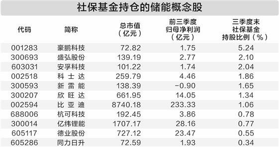 截至三季度末,11只储能概念股获得社保基金持仓,豪鹏科技盛弘股份安孚科技科士达等持股比例居前。