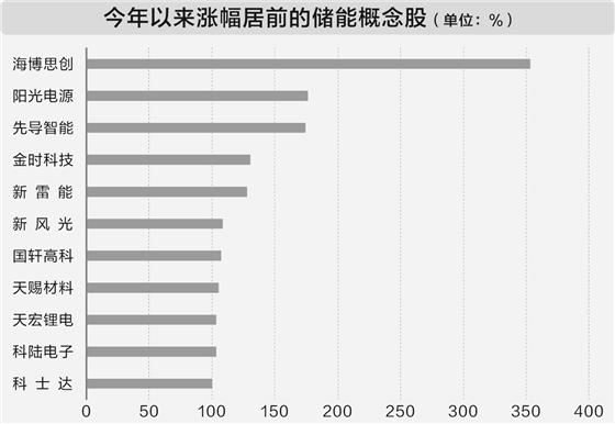 据证券时报·数据宝统计,年内储能概念股平均上涨62.87%,海博思创阳光电源先导智能等11股的股价实现翻倍,海博思创涨幅最高,年内累计上涨352.95%。公司是电化学储能系统解决方案与技术服务提供商,专注于储能系统研发创新,为“源一网一荷”全链条行业客户提供全系列储能系统产品及一站式整体解决方案,在国内储能市场占据较高份额,且在全球储能行业具有较强影响力。