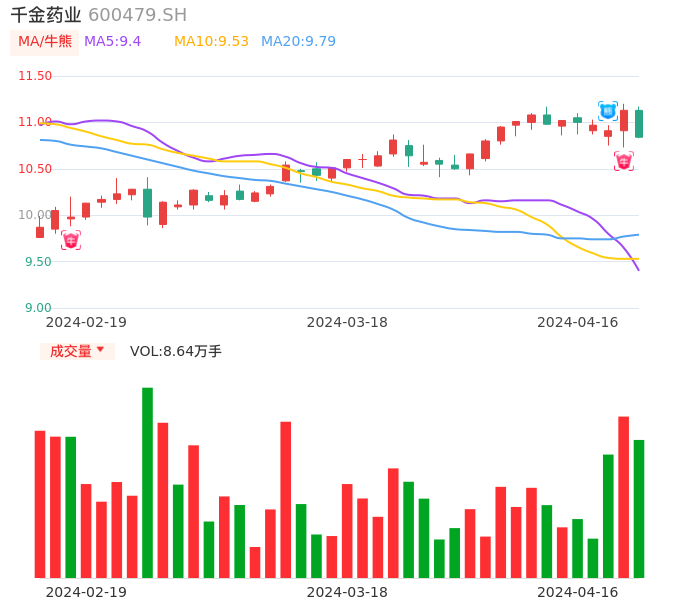04月16日,千金药业收报10.84,股价涨幅-2.61%,成交金额9474.48万元,换手率2.06%。