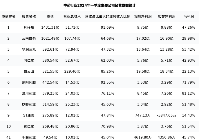 千金药业最新报告期数据为一季度,下表汇总了中药行业内市值靠前的公司一季度主要经营数据