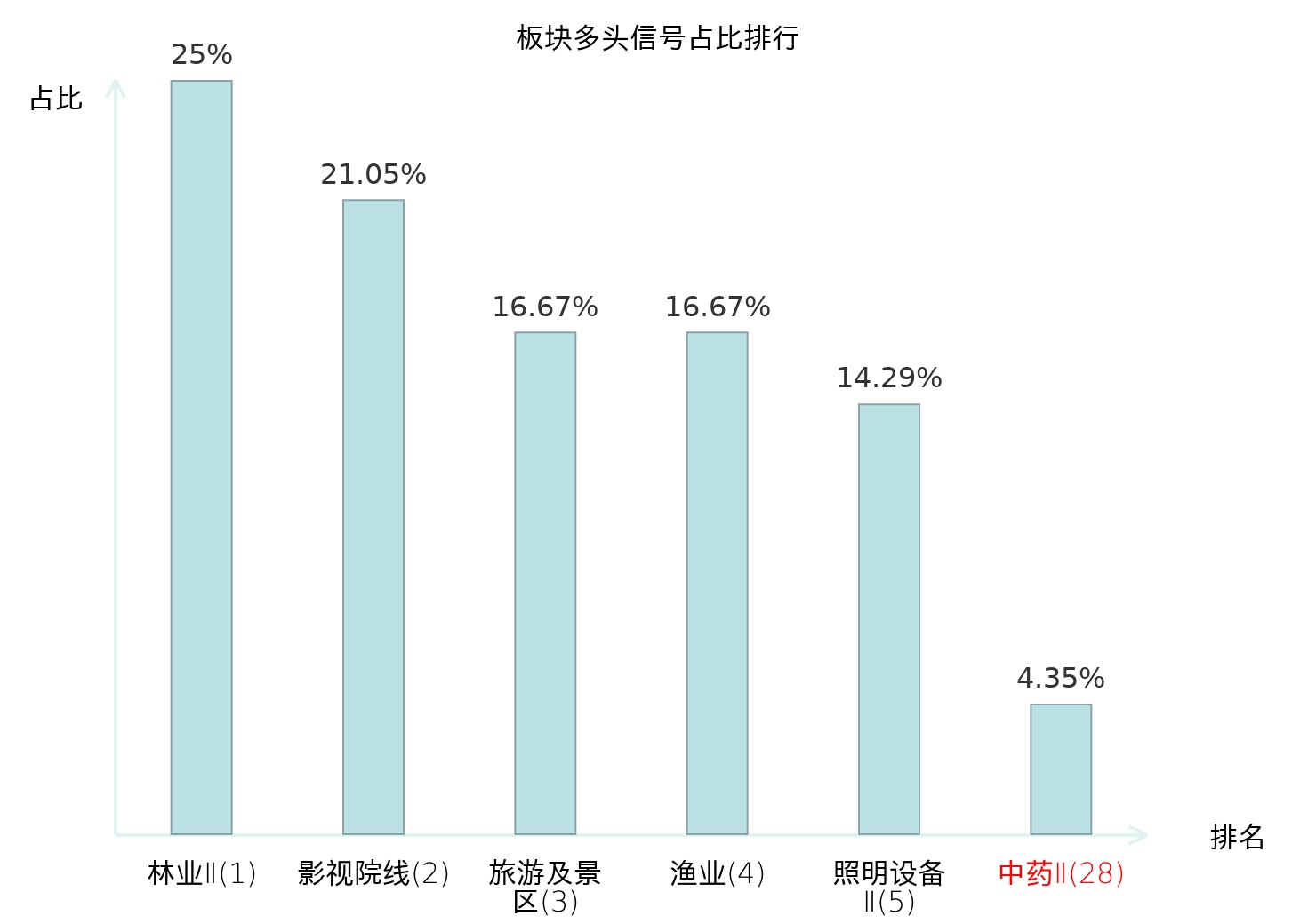 全市场所有行业板块中主力多头信号占比排名中,林业Ⅱ板块位居第一。林业Ⅱ板块名次提升最快,较昨日上升124位。