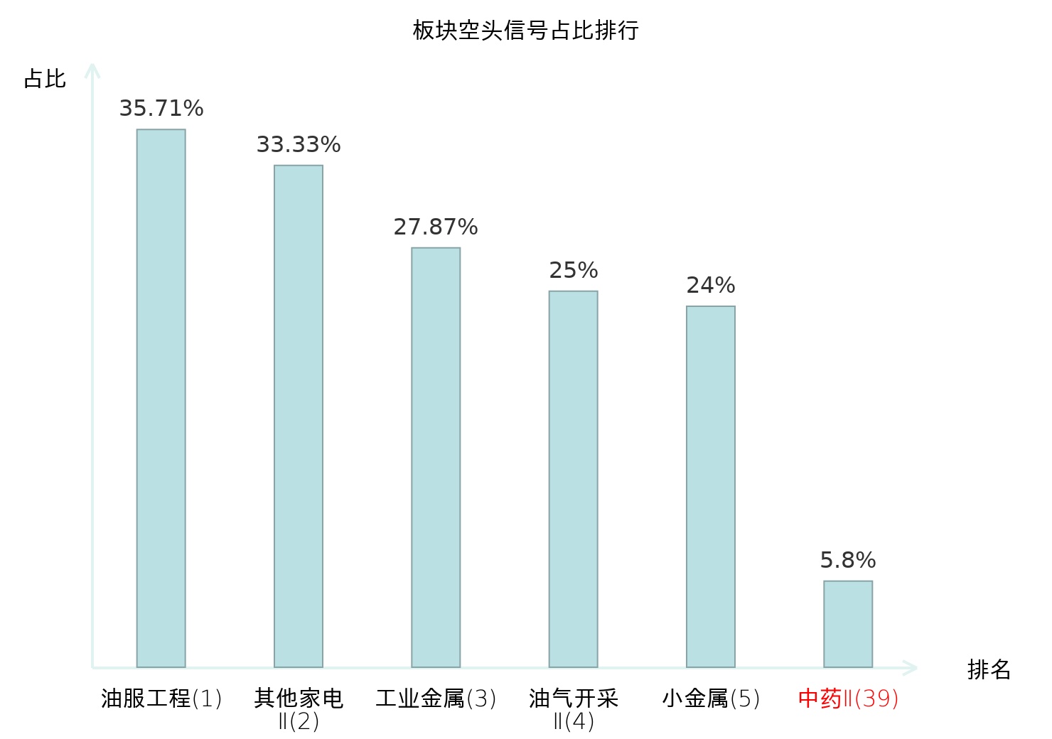 全市场所有行业板块中主力空头信号占比排名中,油服工程板块位居第一。工业金属板块名次提升最快,较昨日上升122位。