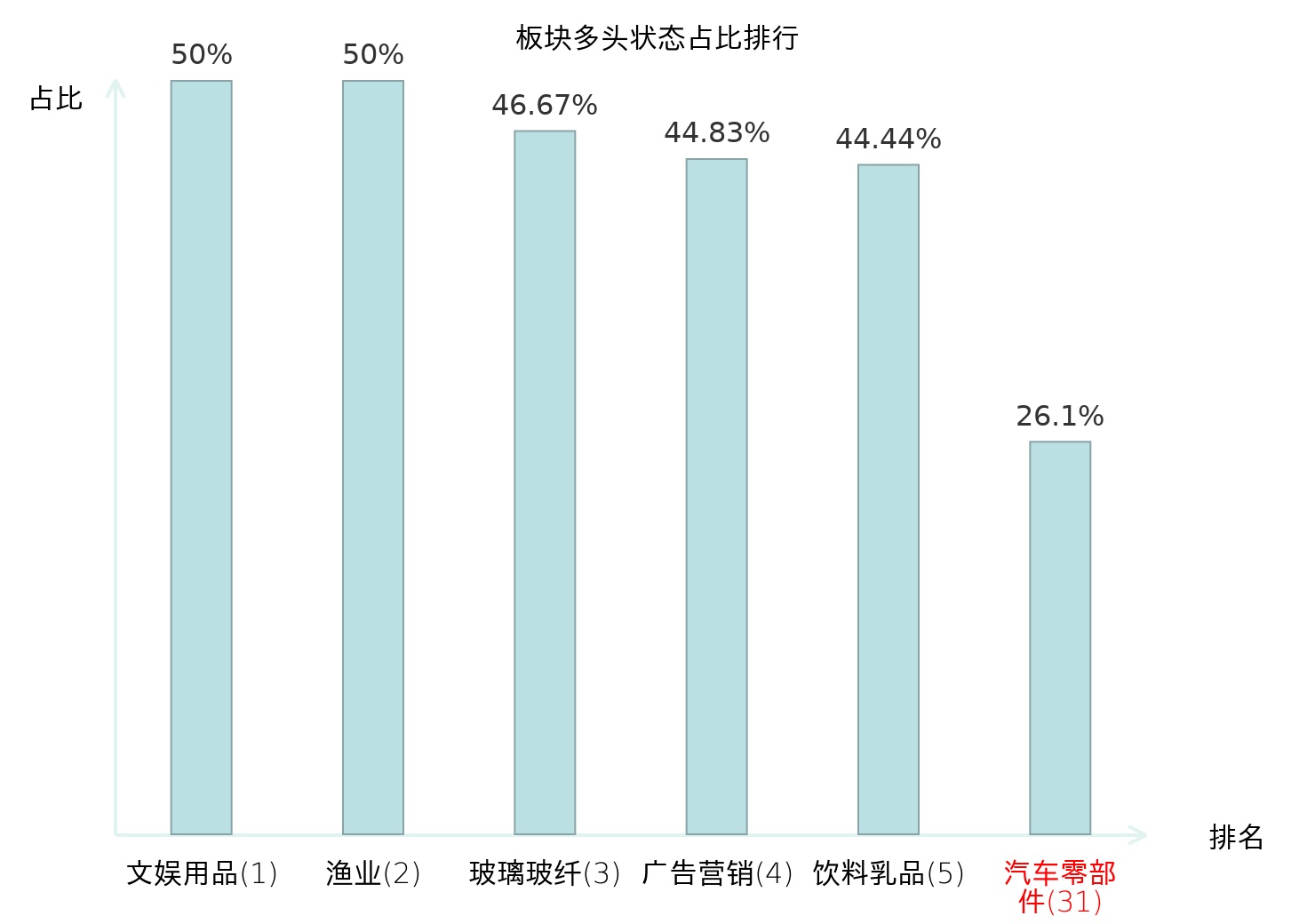 全市场所有行业板块中主力多头状态占比排名中,文娱用品板块位居第一。饮料乳品板块名次提升最快,较昨日上升59位。