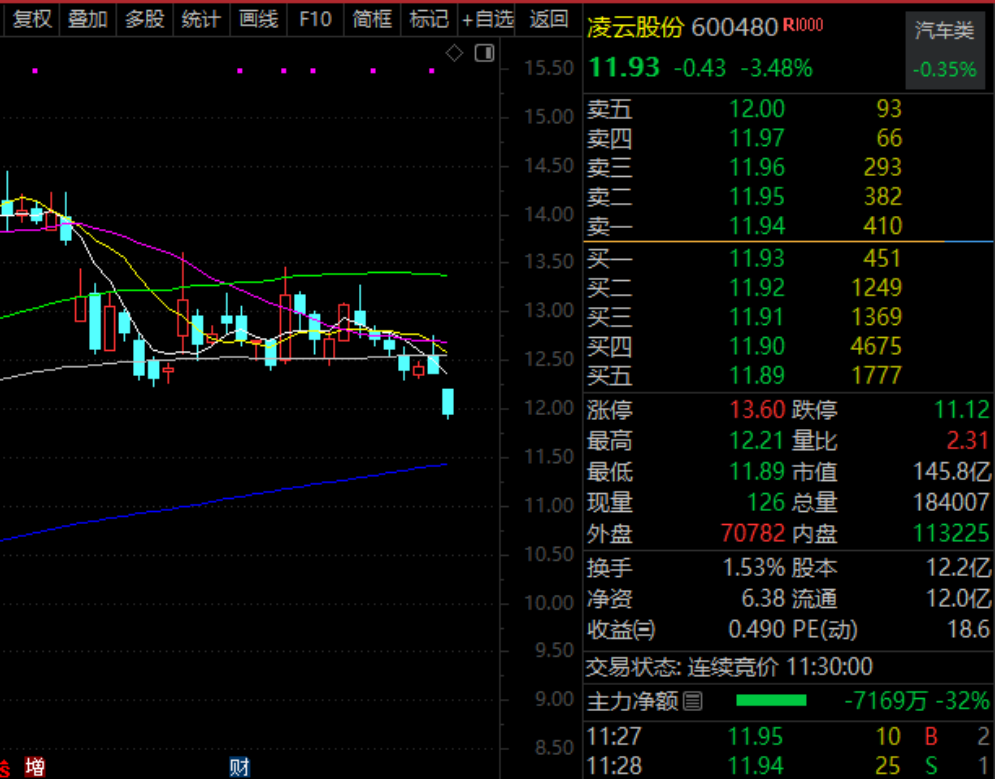 11月17日早盘,凌云股份(600480)低开后直线下杀,股价一度跌破11.9元/股,创出阶段新低。截至上午收盘,凌云股份下跌3.48%,换手率达1.53%,成交额超2.2亿元,已超过上周五全天,显示出较强的抛压。