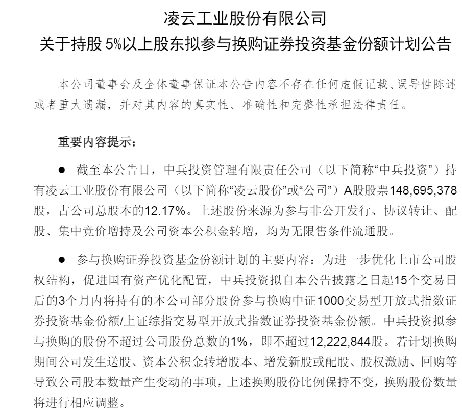 3月20日盘后,凌云股份(600480.SH)发布公告称,第二大股东中兵投资管理有限责任公司拟以不超过1%的公司股份换购ETF基金份额。公告强调,为进一步优化上市公司股权结构,促进国有资产优化配置,中兵投资拟自本公告披露之日起15个交易日后的3个月内将持有的本公司部分股份参与换购中证1000交易型开放式指数证券投资基金份额/上证综指交易型开放式指数证券投资基金份额。中兵投资拟参与换购的股份不超过公司股份总数的1%,即不超过12,222,844股。