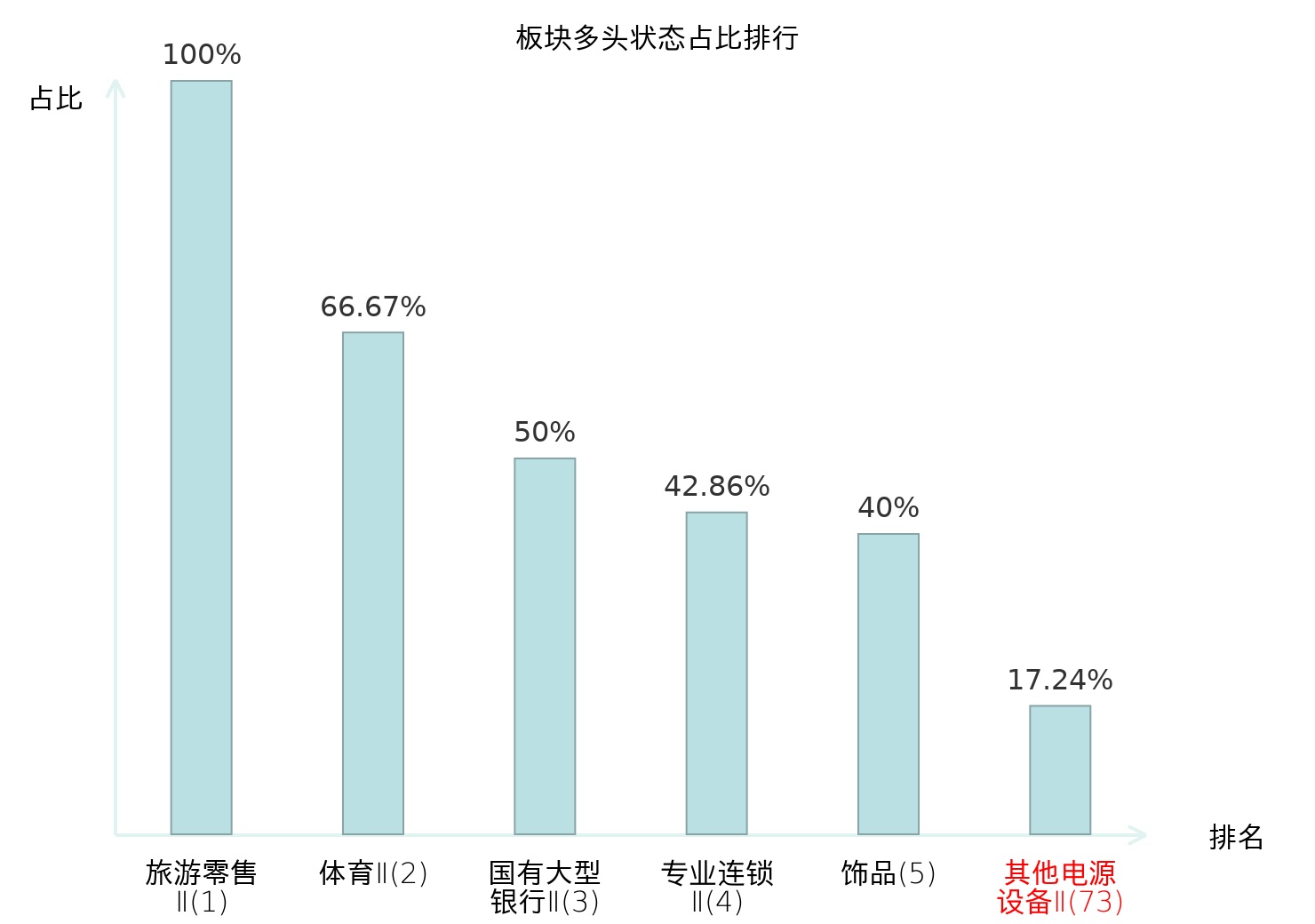 全市场所有行业板块中主力多头状态占比排名中,旅游零售Ⅱ板块位居第一。半导体板块名次提升最快,较昨日上升78位。