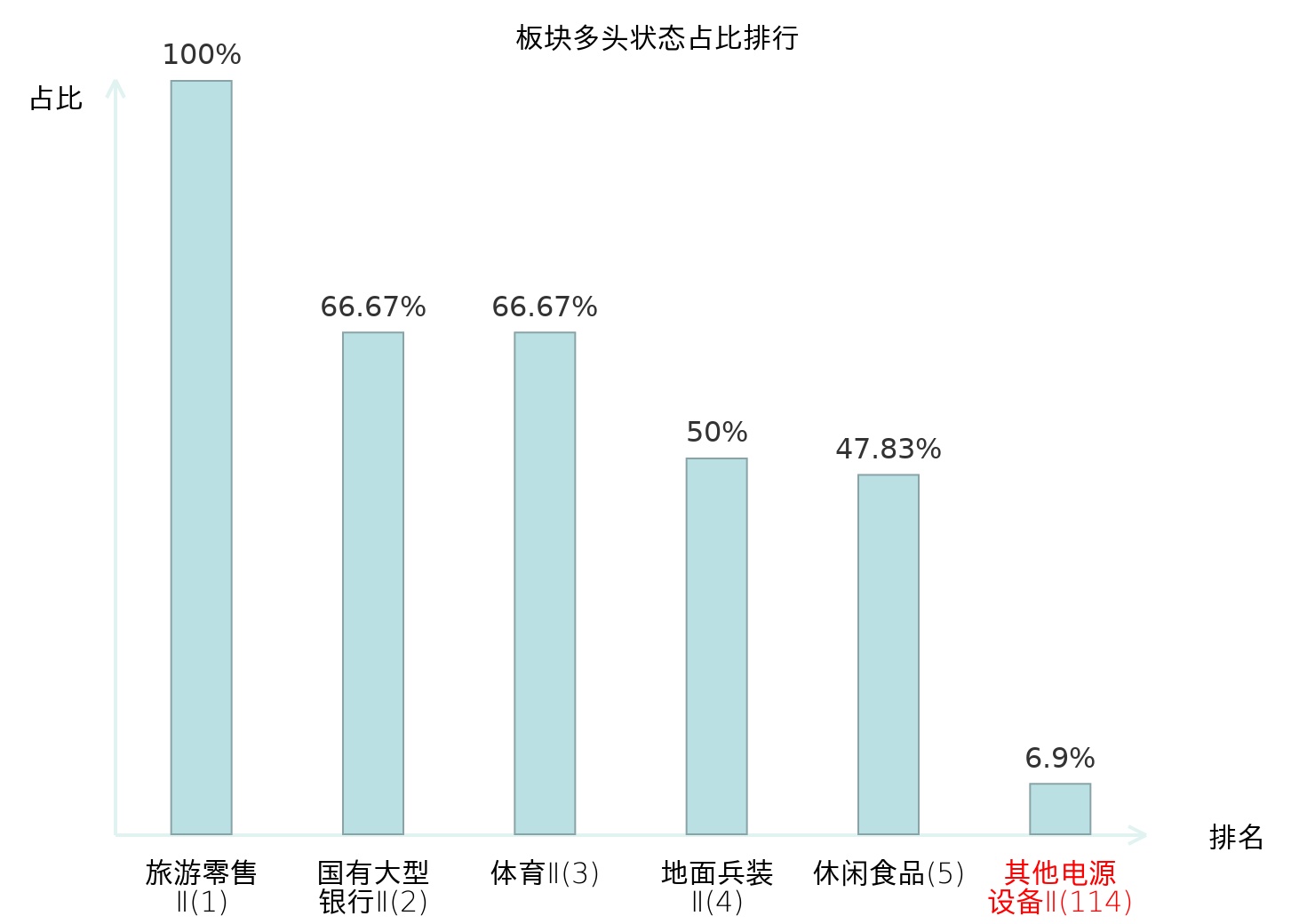 全市场所有行业板块中主力多头状态占比排名中,旅游零售Ⅱ板块位居第一。航空机场板块名次提升最快,较昨日上升80位。