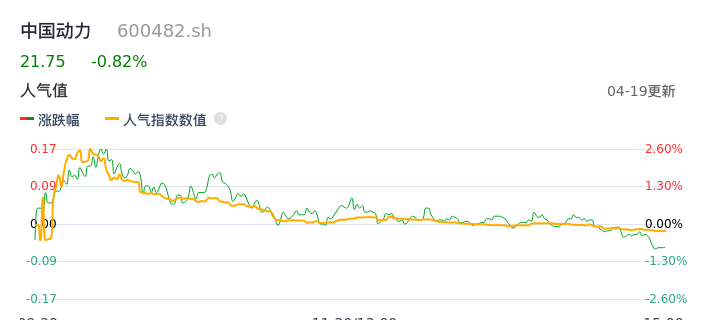 04月19日,中国动力收报21.75,股价涨幅-0.82%,成交金额6.79亿元,换手率1.40%。