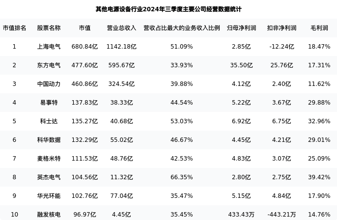中国动力最新报告期数据为三季度,下表汇总了其他电源设备行业内市值靠前的公司三季度主要经营数据