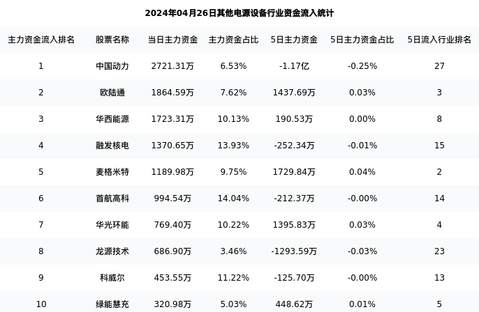 从主力资金流向来看,其他电源设备行业今日主力资金流入14.33亿元,在所有申万二级行业中排名:131/131。