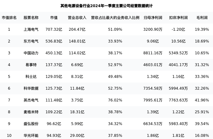 中国动力最新报告期数据为一季度,下表汇总了其他电源设备行业内市值靠前的公司一季度主要经营数据
