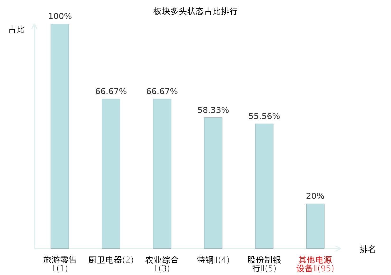 全市场所有行业板块中主力多头状态占比排名中,旅游零售Ⅱ板块位居第一。农商行Ⅱ板块名次提升最快,较昨日上升78位。